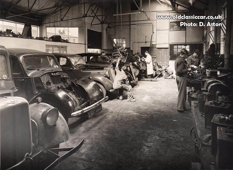 Next, a fine posed shot taken inside Aston's workshop, probably in the late 1940s. Three pre-war cars are in view, does anyone recognise the makes and models?