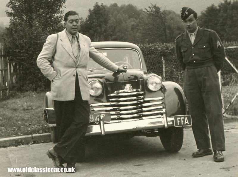 Now, the saloon version of the same car. This front-on view features a dark-coloured Olympia saloon, with two gents - one in uniform - stood with it. A stencilled military plate can just be seen fitted to the left of the car, while on the right is a plate with the letters "FFA" upon it. FFA stands for Forces Francaises Allemagne, the branch of the French military stationed in Germany following WW2.