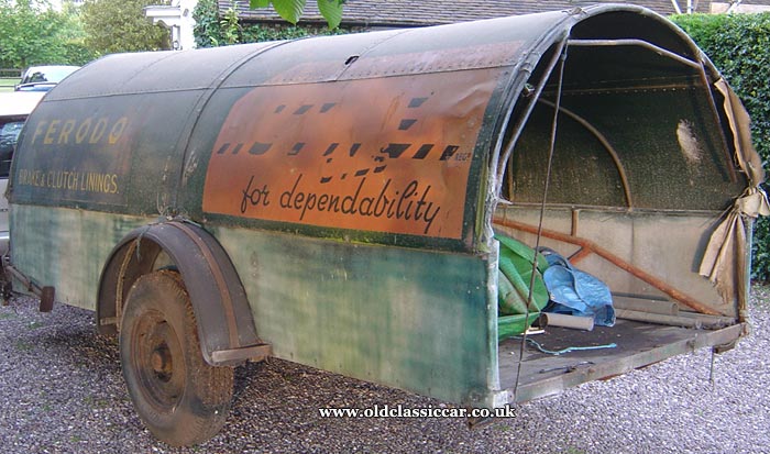 Comparing old and new photographs, the question of what the small circular holes - one above the "Always" word in the Notwen advertisement on one side, and above the Lodge Plugs lettering on the other - has yet to be answered. They don't appear to have had lamps fitted there, and neither reveal anything important in the frame behind. Possibly they had small covers over them "in period", which can't be made out in the old black and white photographs. Maybe they were used in some way to aid removal of the top canopy? The latter, when the trailer was collected, was still secured by small pieces of twisted wire. The canopy's inner framework extends down at each corner, sliding into recesses set into the corners of the main trailer frame.