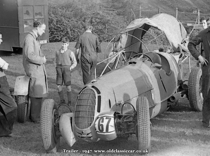 This great photograph was taken in a walled paddock area at a speed event - quite possibly Bo'ness once again. The offside of the trailer is shown with the front end - un-hitched from the Ford tow-car - pointing skywards. Presumably the car had either just been unloaded, or else was being prepared for loading. Note the car is now in his trademark green (with Pegasus) livery. The canvas sides were still in evidence on the trailer at this time. Lowering the trailer down onto the tow-car's hitch must have been a delicate operation. Easiest would have been to use a large trolley jack.