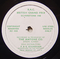 Side 2 features the BARC Jersey Road Race, also in 1948. Again it was produced by Antone, with a note that F. & E. Stoneham, New Bridge St, London EC4 (booksellers to the motorist) were sole distributors for these recordings. Sometime I'd like to get them recorded onto CD.