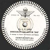 This old vinyl was issued by the Austin company on the launch of the new A40 Devon model. It featured Mr. L. P. Lord