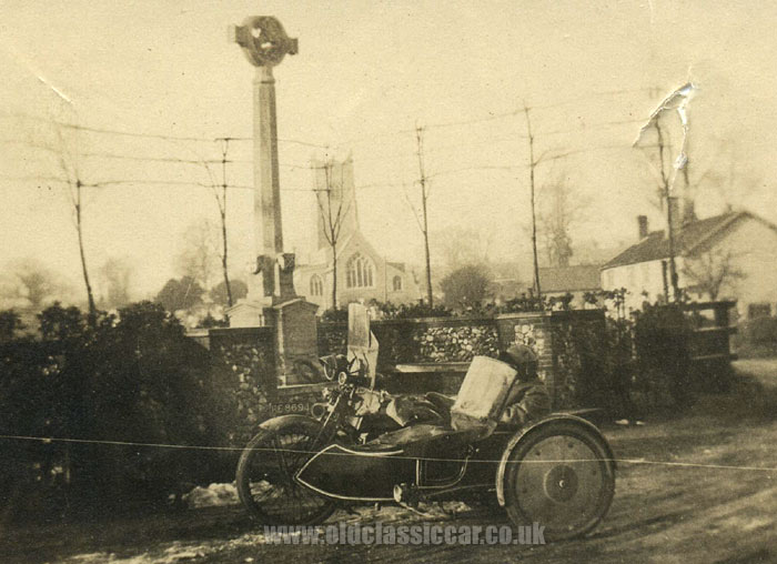 Another from my own collection of old photographs now. The location is the war memorial at Garboldisham, in Suffolk. The date - 1923. A chilly winter's day, with the passenger in the sidecar very well wrapped up while the rider takes the photograph. The motorcycle's registration is RE 8694. Does the distinctive style of road wheel, or disc, fitted to this vintage sidecar help in its identification? St John the Baptist church can just be made out in the distance. Apparently the war memorial is located at the East end of Church Lane, at the junction with the B1111.