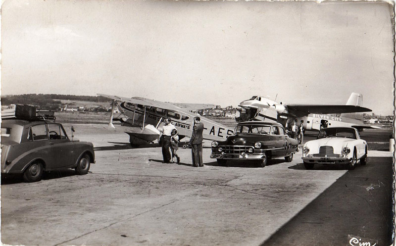 Leo kindly sent this photo-postcard over, featuring not only classic aircraft, but a number of interesting cars. To the left is a laden Triumph Mayflower, with luggage on its roof and a Union Flag