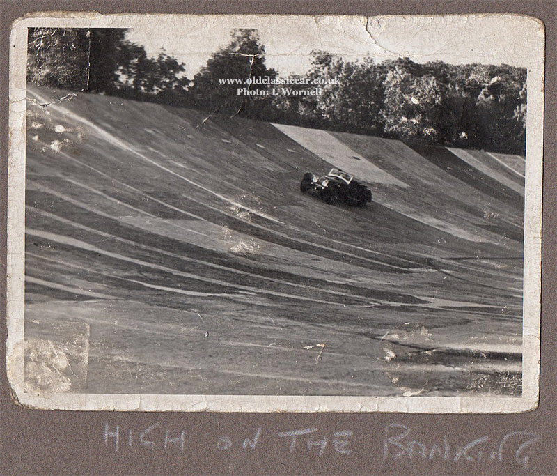 Photo three shows the same car tackling the steeply banked Brooklands track at speed, in this instance with just one person on board