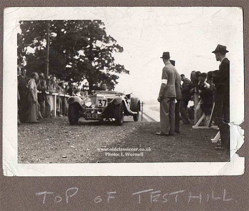 The last of Ian's photographs again shows the car at Brooklands, with competitor number "37" painted on its door, and on a sign tied to the front. The location is the famous test hill at Brooklands, the Squire being caught on film just as it completed the steep incline. One headlamp is at