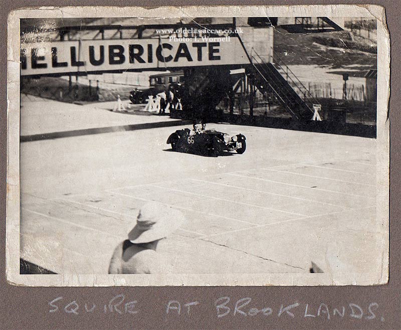 The first of Ian's photographs shows the Squire (entry number 66 in this meeting) passing under a bridge at Brooklands, beneath a large "SHELLUBRICATE" sign.