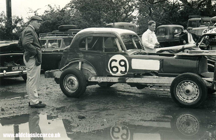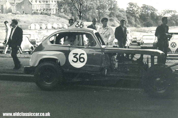 I've not been able to identify the donor bodyshell in this car, car number 36 driven by Willie Harrison. The open exhaust stubs on this car suggest a V8 lurks under that bonnet. Note the much-modified old coach to the left, converted into a stock-car transporter.
