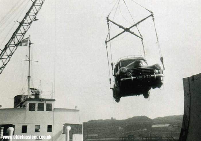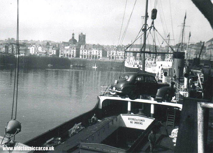 The following five photographs all feature a Vauxhall Velox on a tour of Europe during the 1950's. The car, registration WME 832, hails from the London area, WME dating it at sometime after June 1950. The first two photographs show the Velox being craned on board a ship - no roll on roll off ferries in those days! Note the buildings on the quayside in the background, and the Defense de Fumer / No Smoking sign on the ship. Considering his car is swinging high up in the air, the photos remain remarkably clear, so the Vauxhall's owner wasn't too nervous obviously.