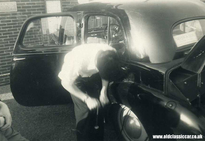 The second shot, which clearly shows the rear-hinged front doors of the Velox, sees one of the lads hard at work with a stirrup tyre pump, inflating the nearside rear tyre. A sign just visible in the car's rear window is advertising a "Seven-a-side" match.