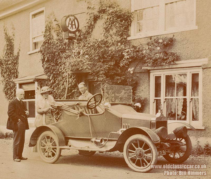 fitted to the headlamps - presumably to protect them from flying stones, kicked up by other motor-cars on the loose surfaces that prevailed on British roads at the time. A very smart "AA Hotel" illuminated sign adorns the building. Bill adds the following background information: