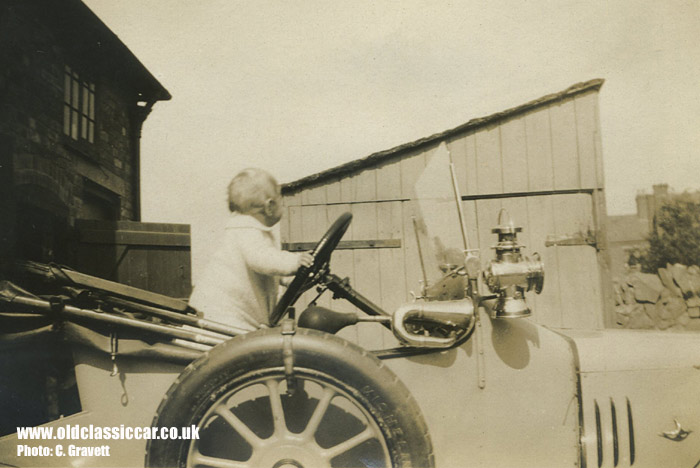 A second picture of the same child and car better shows the Standard's two-seater coachwork, the scuttle-mounted paraffin lamps, and the Michelin tyre mounted to the offside. The hand throttle and advance/retard lever can also be clearly seen, as can the tank for the lamps, mounted on the offside running board. Electric headlamps are also fitted on this example, a 20 pounds option. Another option was a rear dickey seat, for which an extra 3 pounds would be charged.