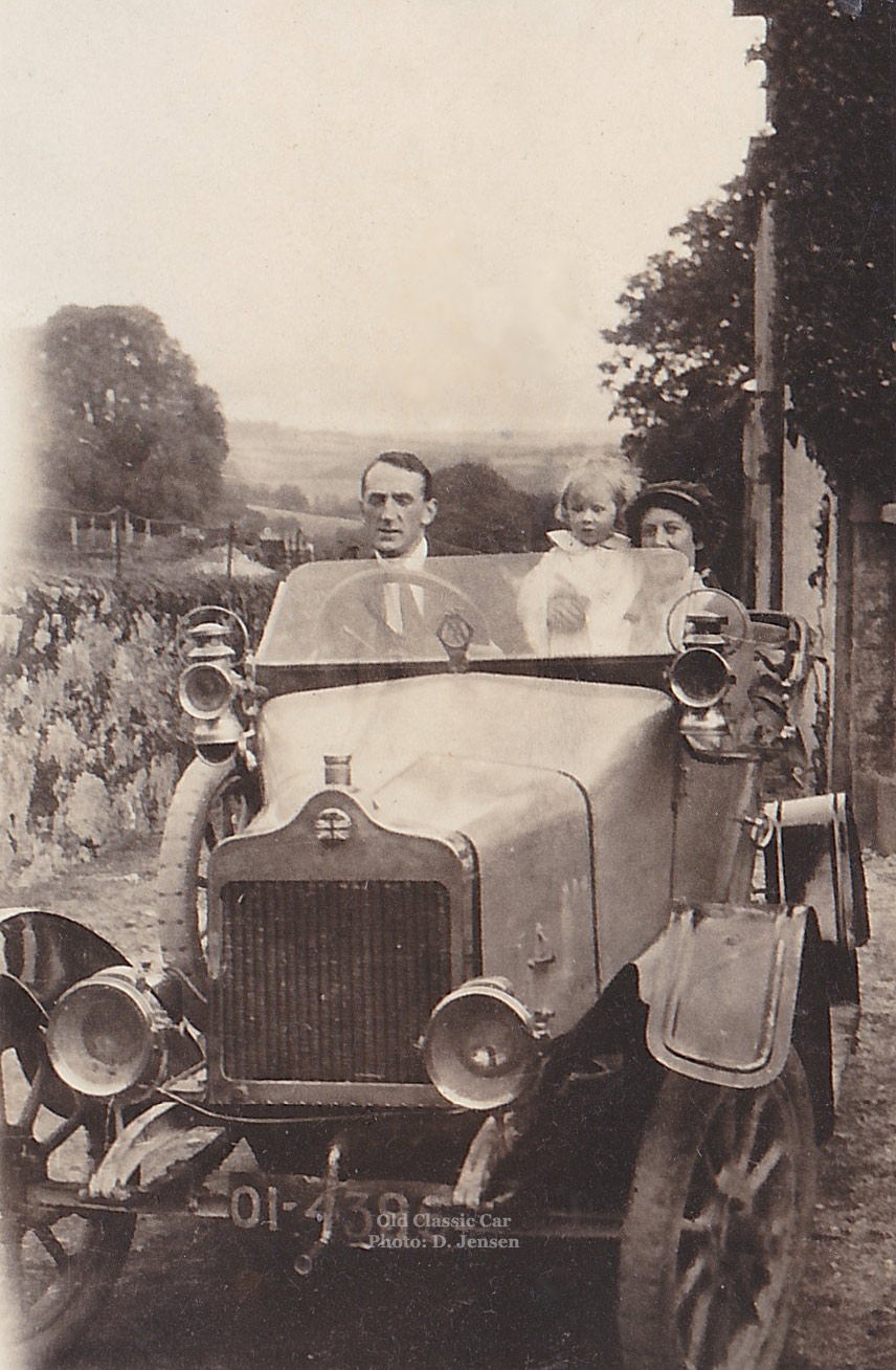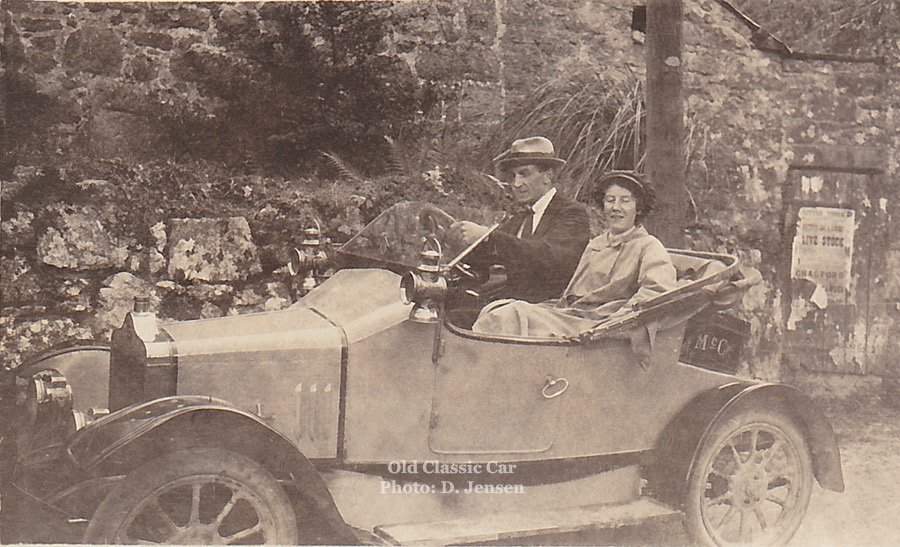 Doctor Mary Gill Caskey. The location is Devon, specifically close to the Dartmoor Sanitarium, located in Chagford, Devon, and the date is c1917. The first of the photos shows the happy couple sat in the Standard - note the metal luggage box mounted on the rear panel, with the letters "McC" (for McCullough) painted on its side. On the stone building in the background are the remains of a poster, possibly for a livestock auction held in Chagford. The distinctive shape of the Standard Rhyl's radiator is clearly visible.