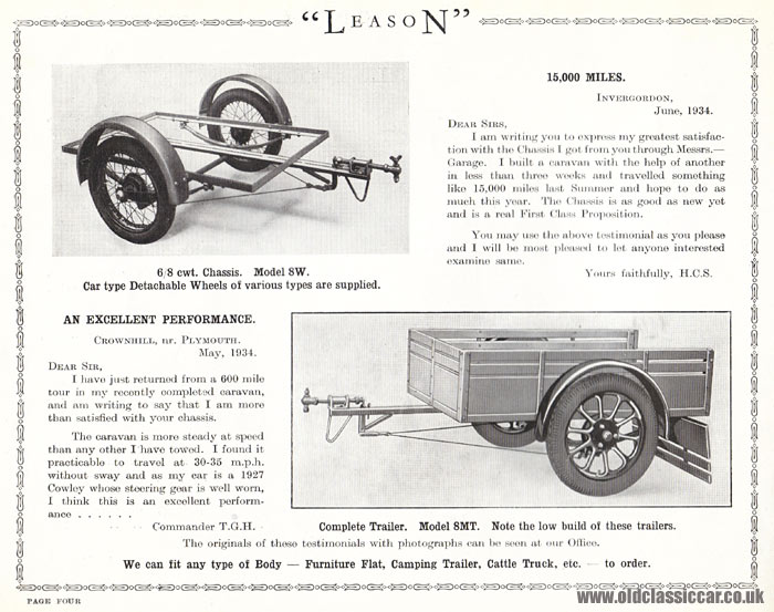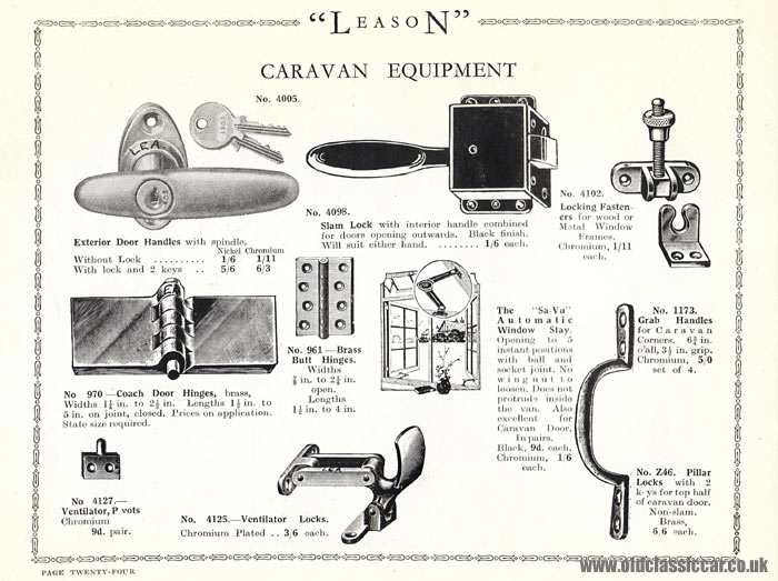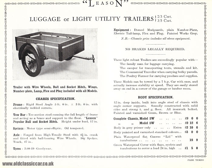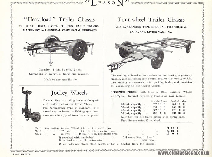 Firstly, thanks to Nick who scanned and emailed over all the pages shown alongside some time back. The catalogue dates to 1937, and was produced by Joseph Lea & Sons (hence the name Leason), who sold a varied selection of trailers, trailer chassis, towing parts, and accessories prior to WW2. For anyone who owns a vintage or classic car, and needs to be able to tow a trailer, one of the trailers shown on this page would look great behind a pre-war car, rather than having a modern trailer coupled to an ancient car. There are also some good views of accessories that anyone restoring an old caravan or car trailer might find useful.