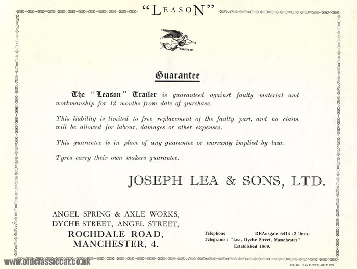 Page 27 showed a copy of the Leason guarantee, advising that any Leason trailer