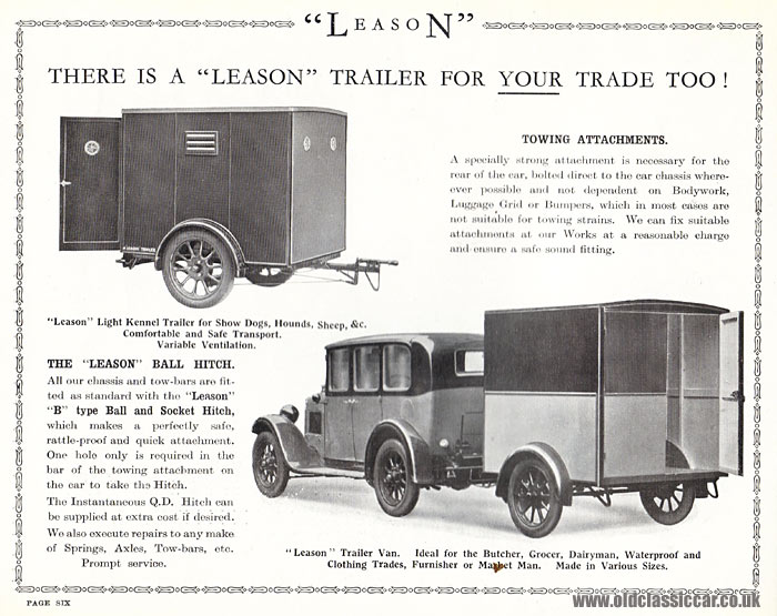 Page 6 shows a smart box trailer, or the 'Leason Light Kennel Trailer for Show Dogs, Hounds, Sheep etc',