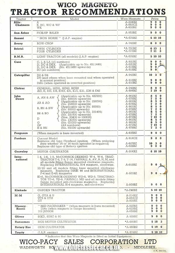 See Homepage. | This page: A leaflet from the 1930s describing the range of Wico magnetos available to tractor operators. |